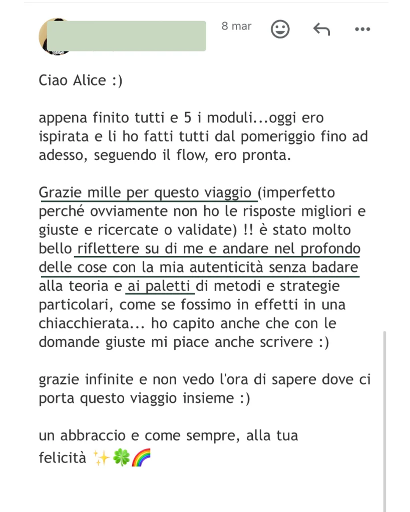 Il mio ruolo è quello di facilitatrice: ti ascolto, ti accompagno a fare chiarezza e ti aiuto a portare all’esterno chi sei davvero, senza maschere né forzature.